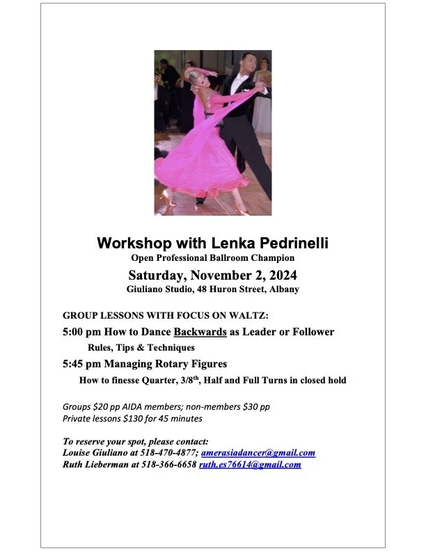 Registration: Mail check (made to “Albany NY AIDA”) with reservation form to Ruth Lieberman, 2311 Brookview Rd., Castleton NY 12033. Ruth’s email: ruth.es76614@gmail.com.